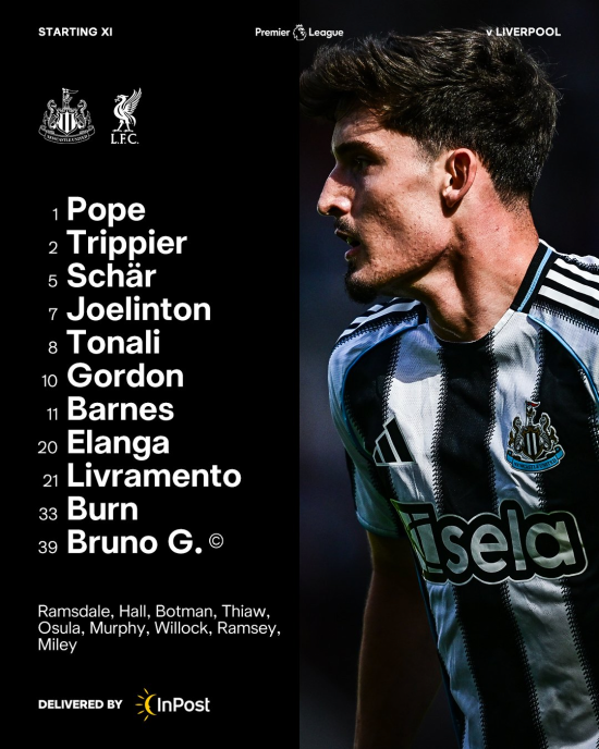 홈팀 뉴캐슬은 4-3-3 전형으로 나섰다. 닉 포프 골키퍼가 장갑을 꼈고 키어런 트리피어, 파비안 셰어, 댄 번, 티노 리브라멘토가 수비를 구성했다. 중원은 브루누 기마랑이스와 산드로 토날리, 조엘린톤이 맡았다. 측면에 안토니 엘랑가, 하비 반스, 최전방에 앤서니 고든이 출격했다.