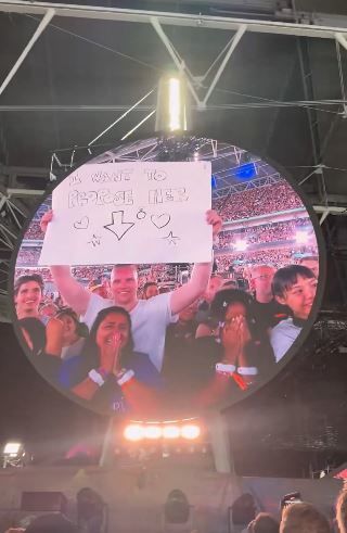 뉴시스 보도에 따르면, 24일(현지시간) 미 매체 피플에 따르면 지난 22일 런던 웸블리 스타디움에서 열린 콘서트에서 '청혼하고 싶다'라는 표지판을 들고 있는 한 남성이 키스캠에 등장했고, 그와 함께 여자친구가 화살표 방향에 서서 환하게 웃고 있는 장면이 키스캠에 포착됐다.