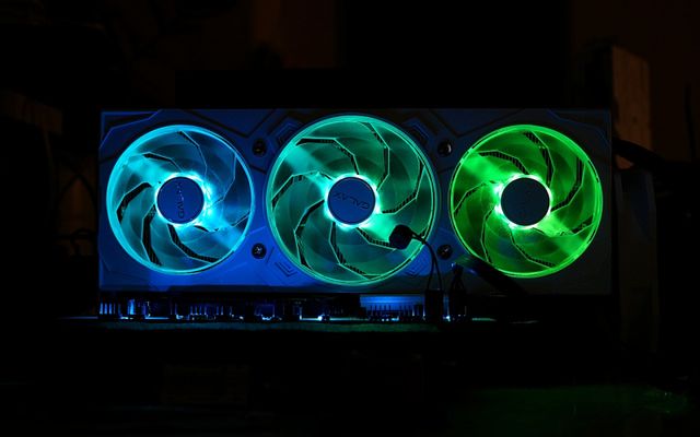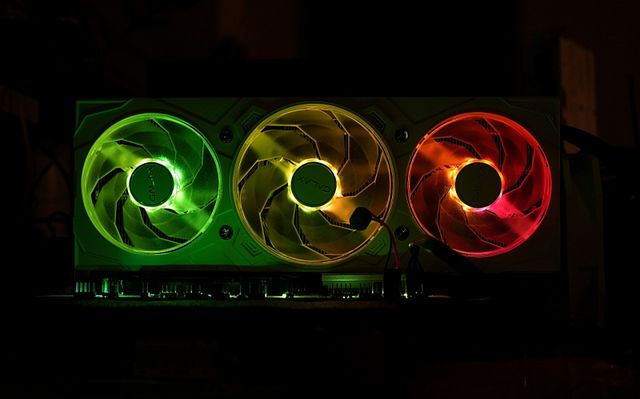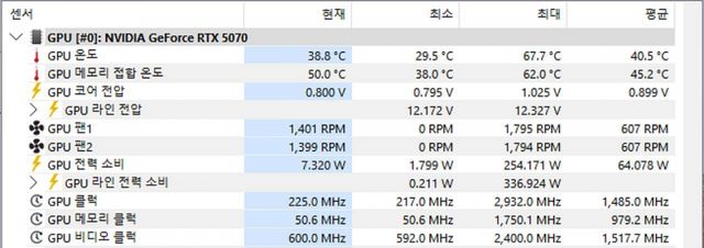 쿨링 구조는 3팬 에어 설계로, 250W급 GPU를 안정적으로 운용하기에 충분하다. 팬은 제로팬 로직을 지원해 가벼운 작업에서는 멈추고, 고부하가 걸리면 즉시 회전해 발열을 제어한다. 덕분에 평소에는 무소음에 가깝고, 게임이나 렌더링처럼 GPU가 바쁘게 돌아가는 순간에는 온도 상승을 억제하면서도 소음을 과도하게 올리지 않는다. 3팬 구조가 주는 장점은 팬 회전수를 낮게 유지할 수 있다는 데 있다. 즉, 동일 온도라면 더 조용하게, 동일 소음이라면 더 시원하게 동작할 수 있는 여유가 생긴다.