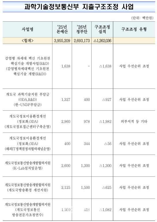기초연구와 출연연 운영비부터 6G·양자 등 신기술 연구개발(R&D)까지 광범위하게 손질하며 선택과 집중 기조를 강화했다. 우편·방송·국제협력 등 관행적 지원도 줄여 재정 효율화로 AI 등 미래 투자 재원 마련에 방점을 찍었다.