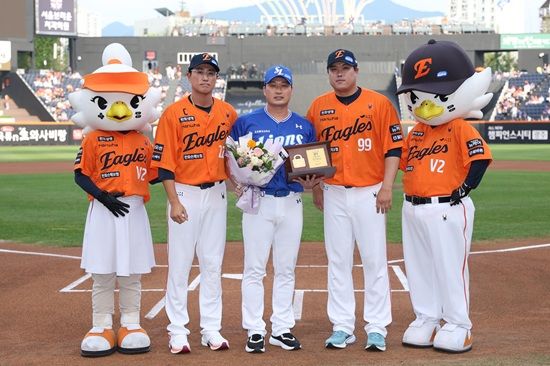 31일 대전 한화생명볼파크에서 열린 2025 신한 SOL 뱅크 KBO리그 한화 이글스와 원정경기를 앞두고 오승환의 은퇴투어 행사가 진행됐다. 양 팀 선수단이 기념 촬영을 함께했고, 한화 주장 채은성과 베테랑 투수 류현진이 대표로 선물을 전달했다.