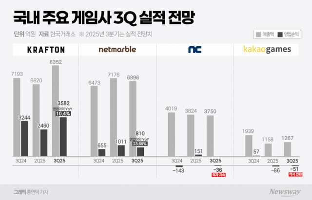 업계 한 관계자는 "신작의 여부 및 흥행 등이 각 게임사들의 실적을 가른 것 같다"고 운을 뗐다. 그러면서 "다만 엔씨의 경우 '아이온2'부터 각 게임사가 여러 신작 출시를 앞두고 있어 향후 실적이 개선될 여지도 충분하다"고 설명했다.