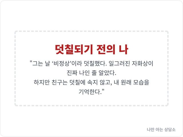 하지만 이 ‘변함없는 친구’는 그 덧칠에 속지 않습니다. 그녀는 당신의 원본, 그가 오염시키기 이전의 맑고 단단했던 당신의 영혼을 기억합니다. 그녀에게 당신은 여전히 ‘유쾌하고’, ‘똑똑하며’, ‘강한’ 사람입니다.