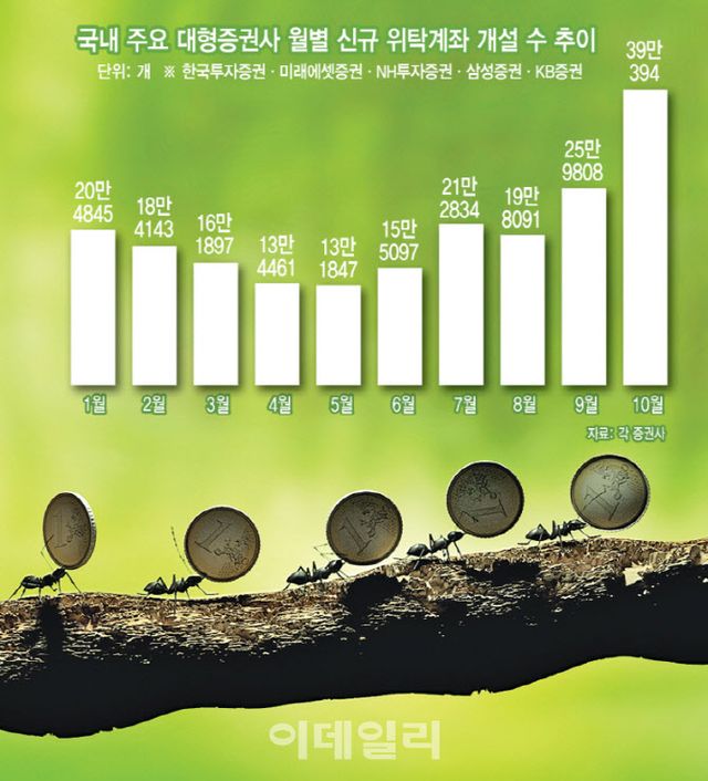 9일 이데일리가 국내 주요 대형 증권사(한국투자증권·미래에셋증권·NH투자증권·KB증권·삼성증권)에 의뢰해 분석한 결과 5개 증권사의 10월 신규 계좌 개설 수는 총 39만 393개(주식 위탁계좌에 한정)로 한 달(25만 9808개) 새 약 50.2% 증가했다. 월별로 나눠보면 지난 4월 미국 트럼프발 관세 충격으로 신규 위탁계좌 개설 수가 13만개까지 내려앉았다가 5월 13만 1847개, 6월 15만 5097개, 7월 21만 2834개, 8월 19만 8091개, 9월 25만 9808개로 나타났다.