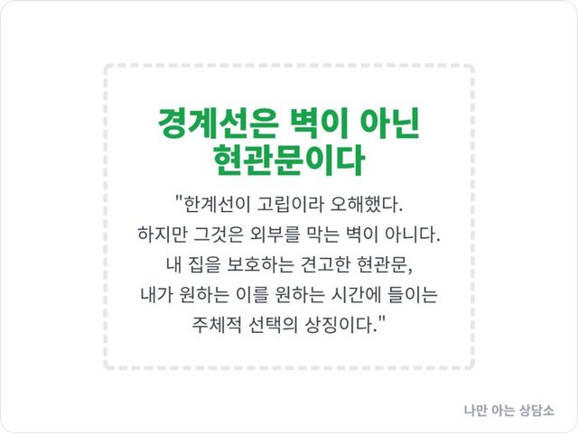 하지만 분명히 해야 합니다. 한계선은, 당신을 고립시키는 10미터짜리 콘크리트 장벽(Wall)이 아닙니다.한계선은, 당신의 집을 보호하는 견고하고 아름다운 현관문(Front Door)입니다.