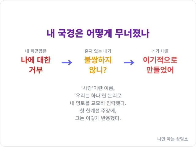 애초에 당신은 한계선이 없는 사람이 아니었습니다. 당신도 당신의 삶과 당신의 영토를 가진, 당당한 주권 국가였습니다. 하지만 그는 교묘한 전략가였고, 당신의 영토를 야금야금, 아주 치밀하게 잠식해 들어왔습니다.
