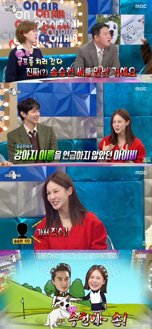 이어 아이비는 "어느 날 골프를 치러 갔다가 진짜 송승헌 씨를 거기서 만났다"며 "강아지 이름을 부끄러워서 말을 안했는데, 나중에 들어보니 같이 계신 송승헌 씨 일행분이 (송승헌에게) '야 가서 짖어'라고 했다더라"고 이야기해 웃음을 자아냈다.