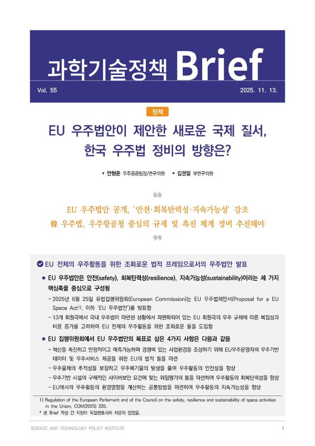 STEPI는 제55호 ‘과학기술정책 Brief’를 통해 EU가 제시한 새로운 규범이 글로벌 우주질서를 재편할 가능성이 크다며 “한국의 법·제도 역시 공공 중심에서 민간·상업 우주활동까지 포괄하는 방향으로 대대적 전환이 필요하다”고 강조했다.