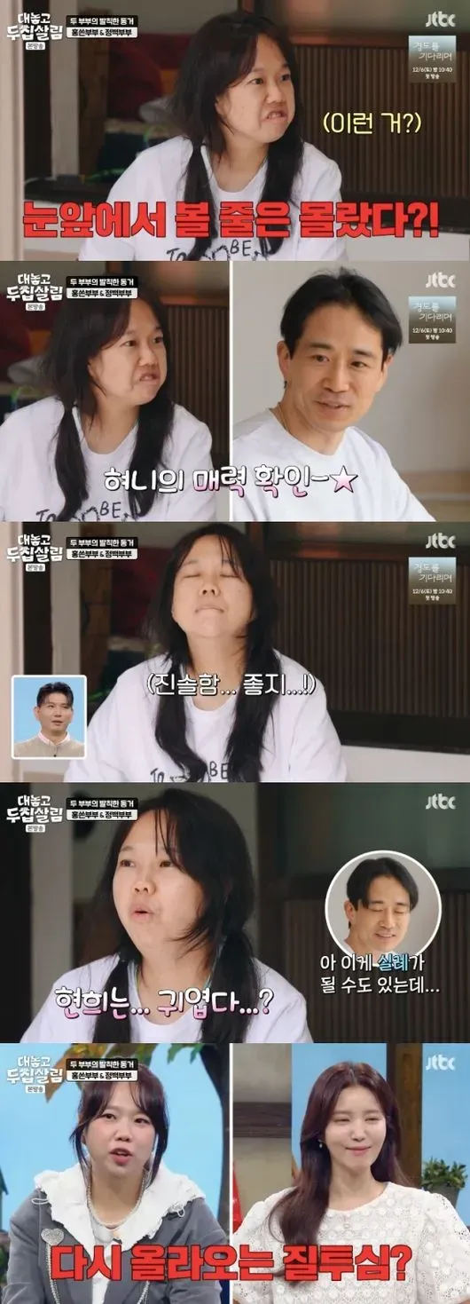 한편 이날 두 부부는 각자 짝을 바꿔 일터로 향했습니다. 백도빈과 홍현희는 메기잡이를, 정시아와 제이쓴은 꽃게잡이에 나섰습니다. 정시아는 백도빈이 "손이 많이 가는 편"이라며 걱정하면서도 "외간 여자와 차를 탄 적이 없으니 둘이서 어떨지 궁금하다"며 귀여운 질투심을 드러냈습니다. 작업 중 장갑이 불편해 보이던 정시아의 손을 제이쓴이 덥석 잡고 장갑을 다시 끼워주자, 정시아는 "든든했다. 남편과는 좀 다른 느낌이었다"고 솔직하게 털어놔 웃음을 유발했습니다.