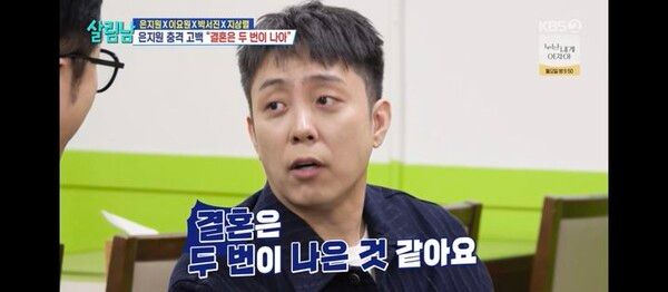 은지원은 조언에 앞서 "제 조언은 충격적일 텐데 괜찮아요?"라고 운을 뗐다. 재혼한 그는 "결혼은 두 번이 나은 것 같다"고 말해 지상렬은 물론 모든 출연진을 당황하게 했다.