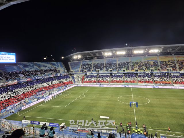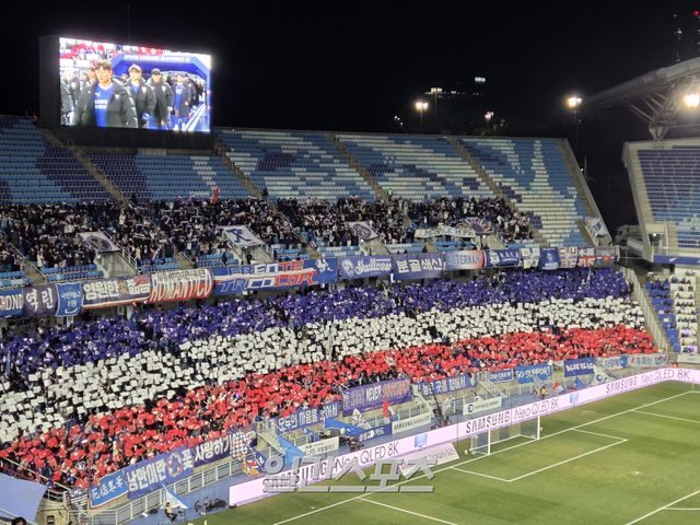 킥오프 전에는 카드섹션으로 선수단을 격려했다. 구단의 ‘청백적’ 컬러를 활용, 홈구장인 빅버드(수원월드컵경기장)를 카드섹션으로 물들였다.
