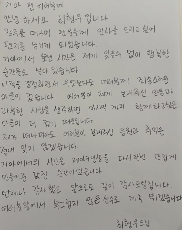 광주를 떠나며 팬분들께 인사를 드리고 싶어 편지를 남기게 되었습니다.