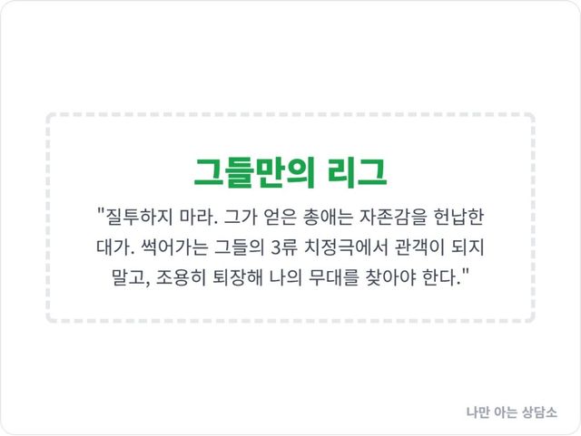 그 무능한 동료가 승진을 하든, 상사와 희희낙락하든 시선을 거두어라. 그것은 비즈니스가 아니라 그들만의 3류 치정극이다. 관객이 되어 분노하는 대신, 극장 문을 열고 나와 당신의 진짜 커리어를 쌓을 수 있는 무대로 이동하라.