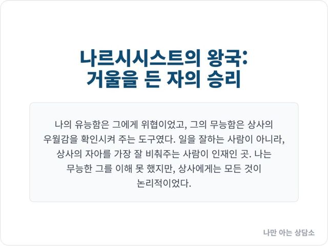 당신은 일을 했고, 동료는 거울을 들었다. 나르시시스트에게 필요한 것은 유능한 일꾼이 아니라, 자신의 위대함을 반사해 줄 깨끗한 거울이다.
