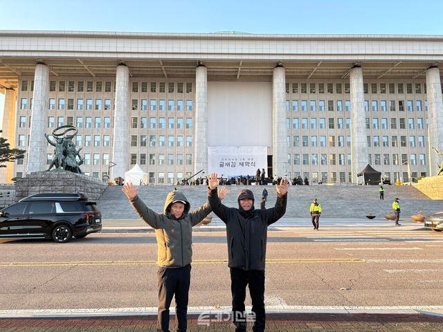 계엄군과 시민의 격렬한 투쟁이 있었던 국회의사당 본관 앞은 그런 적이 없었다는 듯 축제 준비가 한창이였다. ‘글새김 제막식’ 출입이 막힌 두 남성은 비상계엄 1년을 맞아 기쁜 마음을 드러내며 승리의 포즈를 취했다.