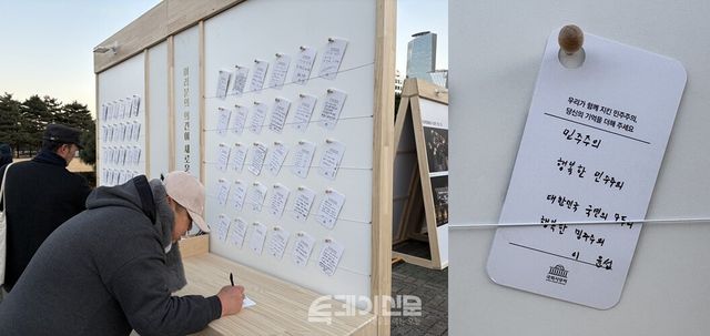계엄군의 헬기가 착륙한 국회 운동장에는 계엄과 관련된 시민들의 기억과 생각을 직접 적어 남길 수 있는 메시지 보드가 설치됐다. 국회의사당 본관으로 향하던 시민들은 하나둘 걸음을 멈추고 자신의 목소리를 적어 보드에 붙이며 공간을 가득 채웠다.
