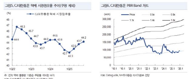 밸류에이션 매력도 언급했다. 정 연구원은 “CJ대한통운은 2026년 예상 실적 기준 주가수익비율(PER) 6.6배, 주가순자산비율(PBR) 0.5배로 여전히 저평가 국면”이라며 “과거 대비 영업외 비용 발생 가능성도 제한적이어서 자기자본이익률(ROE)는 7.6% 수준으로 상승 여지가 있다”고 평가했다.
