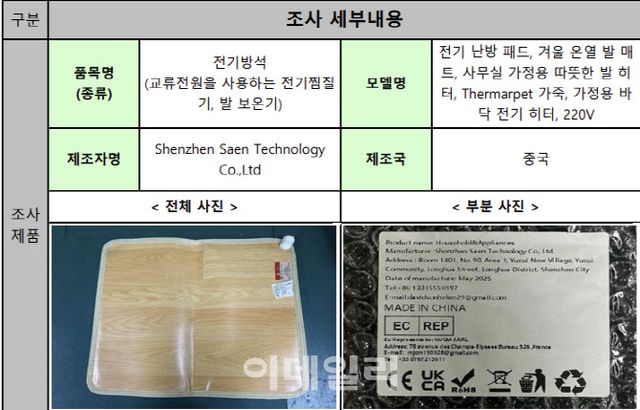 구체적으로 전기용품은 조사대상 115개 제품 중 전기방석(5개), 전지(2개), 전기요(1개), 전기스토브(1개) 등 11개 제품이 안전기준에 부적합했으며, 어린이제품은 조사대상 160개 제품 중 아동용 섬유제품(7개), 학용품(6개), 완구(4개), 유아용 섬유제품(3개) 등 20개 제품이 안전기준에 부적합했다.