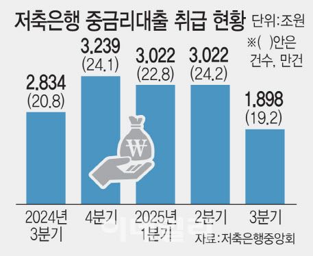 4일 저축은행중앙회 소비자 포털 공시에 따르면 올해 3분기 저축은행권이 취급한 중금리대출은 약 1조 8984억원으로 직전 분기(3조 224억원)에 비해 37.2% 감소했다. 1년 전(2조 8343억원)에 비해서는 33% 줄었다. 저축은행 중금리대출은 정책금융상품인 사잇돌2와 저축은행 자체상품을 포함한 것으로 통상 연 15~16% 금리 신용대출이다.
