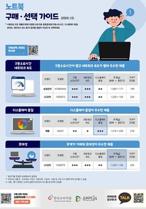 한국소비자원 스마트제품시험국은 “노트북 구동속도는 전 제품이 우수하거나 양호한 수준이지만, 무게, 디스플레이 품질, 배터리 사용시간, 음향 품질 등은 제품별로 차이가 있어 평소 사용 습관을 고려해 제품을 선택하는 것이 바람직하다”고 밝혔다.