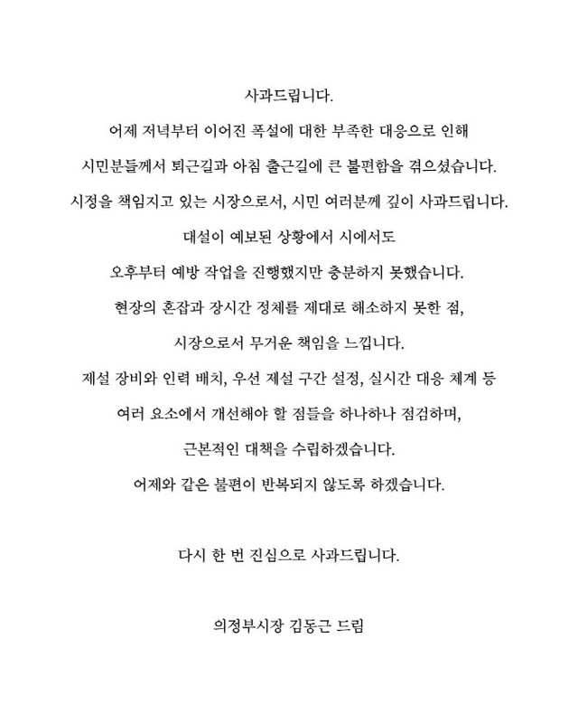 글을 통해 김 시장은 “어제 저녁부터 이어진 폭설에 대한 부족한 대응으로 인해 시민들이 퇴근길과 아침 출근길에 큰 불편함을 겪었다”며 “시정을 책임지고 있는 시장으로서 시민들에게 깊이 사과드린다”고 밝혔다.