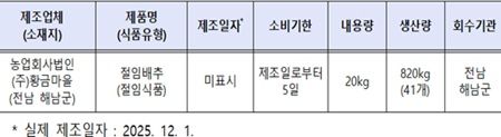 식품의약품안전처(처장 오유경)는 식품제조·가공업체인 ‘농업회사법인(주)황금마을(전남 해남군 소재)’이 제조·판매한 ‘절임배추(식품유형: 절임식품)’에 제조일자를 표시하지 않은 사실이 확인되어 해당 제품을 판매 중단하고 회수 조치한다고 밝혔다.