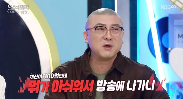 연예인 쇼호스트계의 ‘황소개구리’로 불린다는 그는 “요즘 유튜브를 보면 내가 300억 건물주에 외제차도 3대나 있다고 하더라. 그 소문이 사실이면 내가 굳이 ‘불후의 명곡’에 나왔겠나. 노래 연습도 해야 하는데. 매진을 시켜도, 파리만 날려도 출연료는 똑같다. 10억, 20억이 팔렸다고 그게 내 돈이 아니”라며 억울함을 표했다.