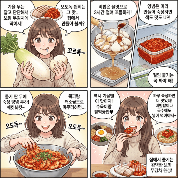 겨울바람이 차가워지면 무의 식감이 단단해지고 단맛이 짙어진다. 특히, 보쌈을 주문할 때 무김치를 먼저 떠올리는 사람도 많은데 오도독 씹히는 느낌과 양념이 어우러진 맛이 깔끔해서다. 집에서도 이 맛을 그대로 준비할 수 있는 레시피가 관심을 끌고 있다.