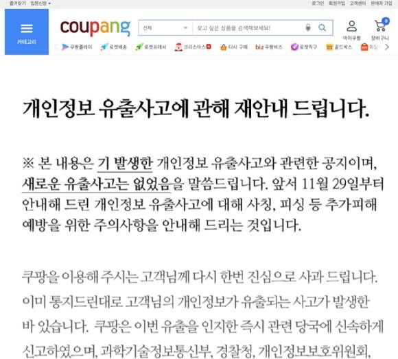쿠팡은 7일 쿠팡 앱과 홈페이지에 '개인정보 유출 사고에 관한 재안내'라는 공지문을 게시하고 유출 대상자인 약 3370만명 고객을 대상으로 문자 통지를 재개했다. 앞서 쿠팡은 지난 11월 말부터 고객 통지를 한 차례 완료한 바 있다.