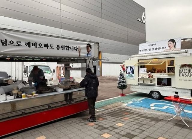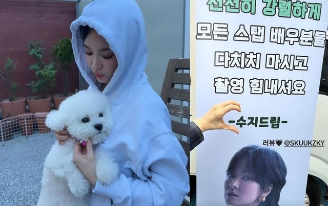 공개된 사진엔 수지가 송혜교를 위해 준비한 커피차 풍경이 담겼다. 수지는 커피차 곳곳에 “지니야, 혜교 언니를 응원한다” “‘천천히 강렬하게’ 모든 스태프 배우 분들 다치지 말고 촬영 힘내시길” “현장을 지켜주시는 스태프 배우 분들 맛있는 커피 드시길” 등의 메시지를 남기며 송혜교와 ‘천천히 강렬하게’를 응원했다.