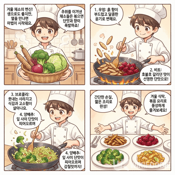 생채소는 아삭한 식감이 장점이지만, 열을 만나면 질감이 부드러워지고 숨겨져 있던 향과 단맛이 살아난다. 겨울 채소는 저온에서 자라며 당도와 조직 밀도가 올라가는 특징이 있어 가열 조리에 잘 맞는다. 팬에 살짝 볶는 과정만으로 성질이 완전히 바뀌는 식재료도 여럿이다.