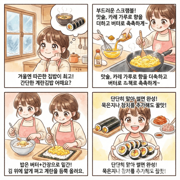 밥과 계란, 김만 준비해도 충분히 한 끼가 갖춰지는 계란김밥은 이런 날씨에 잘 맞는다. 버터가 들어가면 향이 길게 남아 밥과 계란이 자연스럽게 어울리고, 카레 가루가 더해지면 색과 향이 은은하게 살아난다.