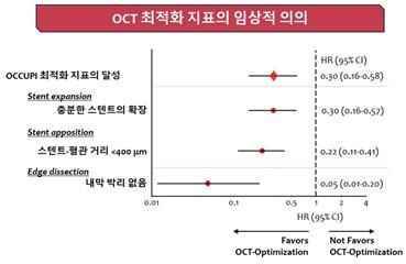 (그림설명 : OCT 최적화 여부에 따른 1년 내 심장사, 심근경색, 스텐트 혈전증 등 주요 심혈관 사건을 분석한 결과, 최적화 지표 달성 시 위험비는 0.3으로 심혈관 사건 발생 위험이 약 70% 감소한 것으로 나타났다.)