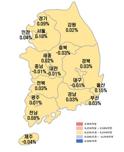 지방은 0.02% 올라 전주와 상승폭이 같았다. 9월 마지막 주 이후 하락세가 멈춘 후 11월 첫째 주부터 상승세로 돌아섰다. 울산은 0.12%에서 0.15%로 상승폭이 커졌다. 부산은 0.03%, 세종은 0.02%의 상승률을 기록했다.