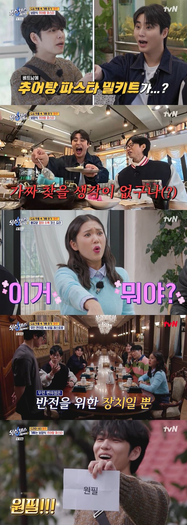 이날 식센이들은 ‘드라마시티 in 파주’를 주제로 ‘응답하라 1988’, ‘육룡이 나르샤’, ‘시크릿 가든’까지 드라마 제목으로 표현된 세 곳의 핫플레이스를 방문했다. 먼저 레트로 감성이 충만한 ‘응답하라 1988’ 가게는 추어탕 파스타라는 독특한 메뉴를 판매했다. 무엇보다 원필이 베트남 공연 케이터링에 추어탕 파스타 밀키트가 있었다고 해 제작진의 사전 작업을 의심케 했다.