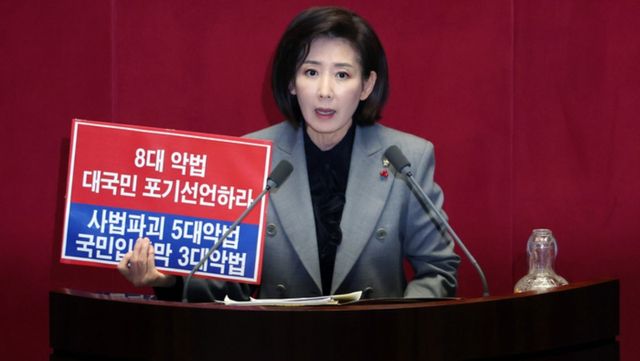지난 9일 국회 본회의에서 나경원 국민의힘 의원이 쟁점 법안인 가맹사업법 개정안에 무제한 토론을 시작하며 손팻말을 들고 있다. / 연합뉴스