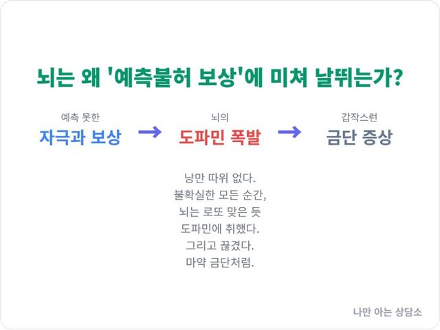 이때 상대방이 던지는 다정한 문자 하나, 갑작스러운 고백은 뇌 입장에서 ‘로또 당첨’과 같은 충격을 준다. 예측하지 못했던 거대한 보상이 주어질 때, 도파민 수치는 기준치를 훨씬 웃돌며 폭발한다. 우리는 이 화학적 폭발을 ‘운명’이라고 착각한다.