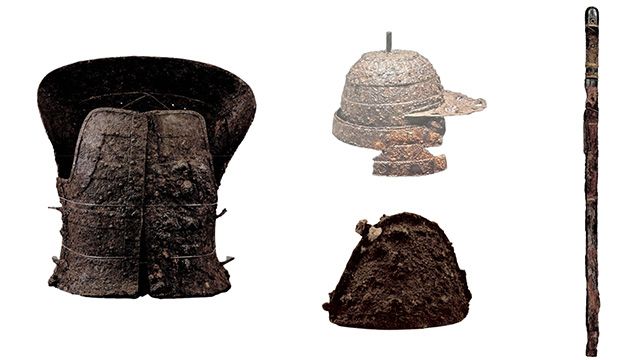 투구는 야구모자와 같이 앞쪽에 챙이 달린 모양으로 높이 20㎝, 직경 31㎝의 크기이다. 5세기 즈음 한반도 남부와 왜에서 유행하던 방식으로 일본에서는 다수 출토되고 있지만, 우리나라에서는 출토되는 일이 드문 유물이다. 원두대도는 명칭 그대로 칼의 손잡이 끝부분이 둥그렇게 되어 있으며, 금은으로 장식하고 있고 길이는 93.3㎝이다. 오구라 컬렉션에는 금은으로 장식한 대도(大刀)가 다수 존재하는데, 이 원두대도와 같이 그 상태가 거의 고스란히 남아 있는 것은 흔치 않다.