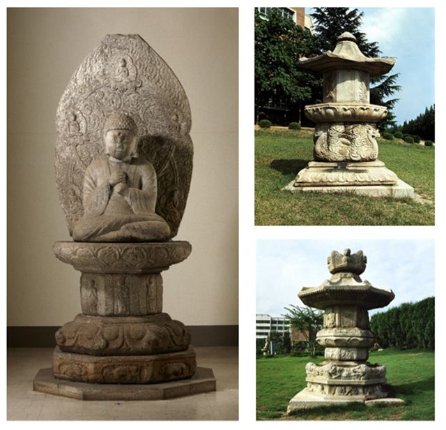 오구라 다케노스케가 수집한 석조 유물 중에는 보물로 지정된 것들이 있다. 보물 제335호 석조비로자나좌상(石造毘盧遮那佛坐像)과 보물 제135호 대구 산격동 연화 운룡장식 승탑(大邱山格洞蓮花雲龍裝飾僧塔), 보물 제258호 대구 산격동 사자 주악장식 승탑(大邱山格洞獅子奏樂裝飾僧塔)이 그것이다. 석조비로자나좌상은 높이가 275㎝이며 통일신라시대 유물로 추정되고 있다. 석조승탑 2점은 모두 높이 280㎝이고, 고려시대 유물로 추정되고 있으며 승탑이 세워져 있었던 원래 위치와 승탑이 누구의 것인지는 알 수 없는 상태이다.