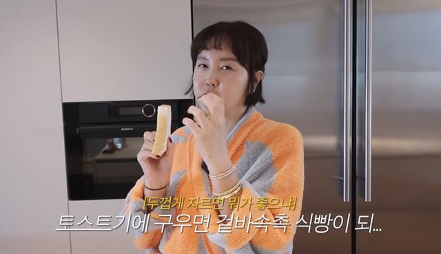 황혜영은 “애들이 아침 일찍 등교해서 저는 그 시간에 밥을 못 먹는다”라며 “애들 보내고 나면 스트레칭·화분 물주기·청소하기 등으로 잠에서 깨고 아점을 챙겨 먹는다”라고 일상을 공개했다. 이어 “특별한 건 없다. 전날 먹고 남은 걸 먹을 때도 많다”라며 “나는 빵을 정말 좋아한다. 특히 식빵을 좋아한다”라고 말하며 냉동실에서 빵을 꺼내 보였다. 그는 “생식빵을 좋아한다. 항상 2~3cm 정도 두껍게 잘라달라고 한다. 두꺼워서 토스터기에 구우면 겉바속촉이 된다”라고 설명했다.