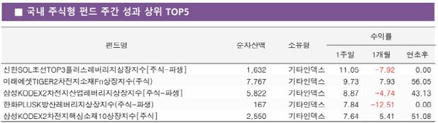 이밖에 2차전지를 테마로 한 ETF도 눈에 띈다. 미래에셋자산운용의 ‘TIGER 2차전지 소재 Fn상장지수’(9.73%), 삼성자산운용의 ‘KODEX 2차전지 산업 레버리지 상장지수’(8.87%), 삼성자산운용의 ‘KODEX 2차전지 핵심소재 10’(7.64%)이 한 주간 수익률 상위권 펀드에 이름을 올렸다.