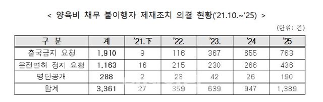 올해 8차례 열린 양육비이행심의위원회의 제재 의결 건수는 1389건으로 지난해보다 46.7% 늘었다. 유형별로는 출국금지 763건, 운전면허정지 436건, 명단공개 190건의 순으로 집계됐다.