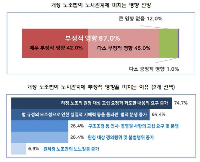 경총에 따르면 응답 기업의 87%는 내년 3월 시행 예정인 개정 노조법이 노사관계에 부정적인 영향을 미칠 것으로 전망했다.
