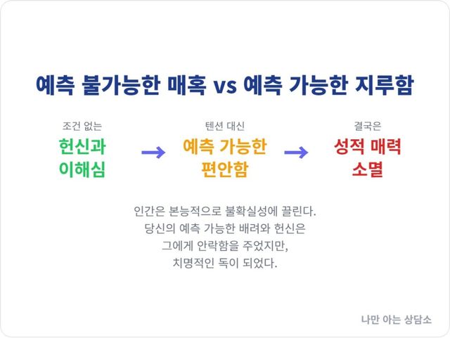 하지만 현실의 연애, 특히 남녀 관계의 역학에서 ‘착함’은 종종 ‘지루함’의 동의어로 전락한다. 당신이 그에게 쏟아부은 그 모든 이해와 용서, 기다림은 당신을 ‘좋은 사람’이라는 안전한 카테고리에 가두어버렸다.