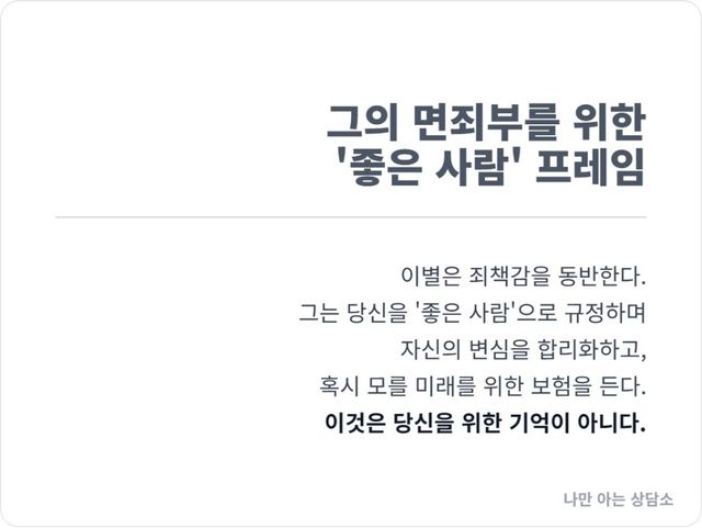 만약 그가 당신을 나쁜 사람이라고 욕한다면, 그는 “왜 그런 여자를 만났느냐”는 자기 선택의 실패를 인정해야 한다. 반대로 당신이 좋은 사람이었다고 말하면, 이별은 누구의 잘못도 아닌 그저 ‘성격 차이’나 ‘상황의 문제’로 포장될 수 있다.