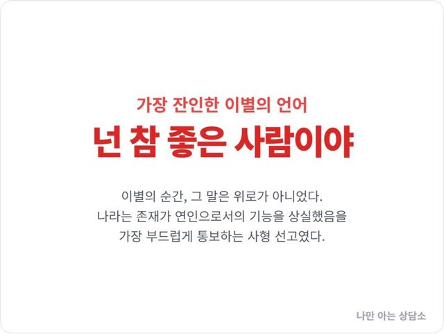 이별의 순간, 상대방 입에서 나오는 말 중 가장 비참한 문장이 있다. “너는 정말 좋은 사람이야.” 혹은 “나한테 과분한 사람이야.” 이 말은 위로가 아니다. 그것은 사형 선고다. 당신이라는 존재가 그의 인생에서 더 이상 ‘여자’나 ‘연인’으로서의 기능을 상실했다는, 가장 부드럽고 예의 바른 통보다.