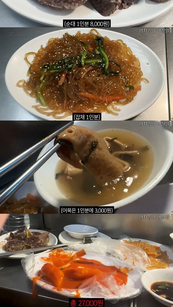 양치승은 한 노점에 앉아 떡볶이, 잡채, 어묵, 만두 등 다양한 음식을 주문해 맛보았다. 음식을 평가하며 그는 "이런 노포의 분위기 때문에 광장시장에 오는 것이지, 맛 때문에 찾는 것은 아니다"라고 솔직한 생각을 밝혔다. 이날 그가 주문한 순대(8천 원), 잡채(5천 원), 어묵(3천 원) 등 음식의 총금액은 2만 7천 원이었다.