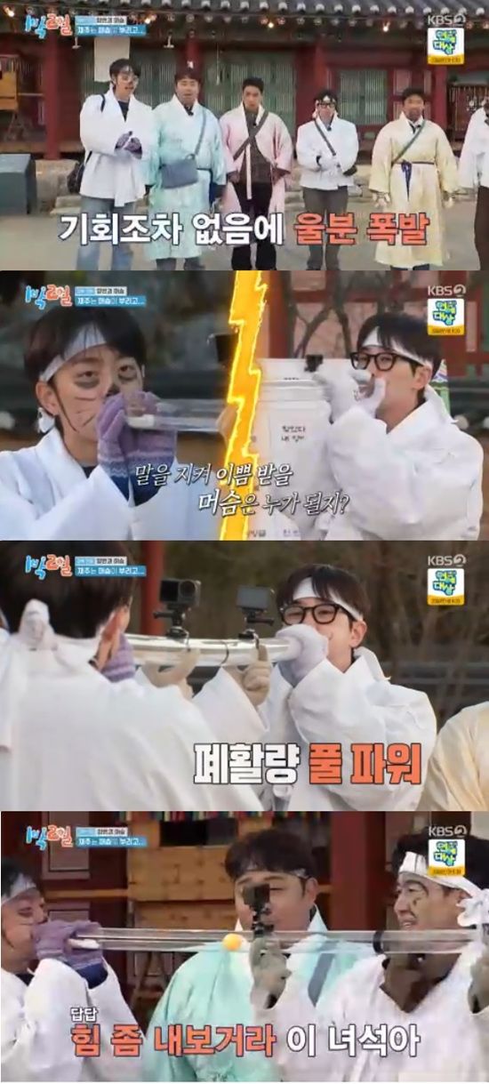 김종민은 주종목인 엽전 제기차기 미션에 걸리며 자신감을 드러냈지만 실패해 당황했다. 조세호는 김종민의 실패로 짜증이 폭발한 나머지 포효했다.
