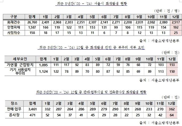 [투어코리아=유경훈 기자 ] 최근 5년(2020~2024년) 동안 서울에서 발생한 화재를 분석한 결과 12월에 가장 많이 발생하고, 인명피해도 가장 많았던 것으로 나타났다.