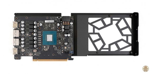 표면은 올 블랙 슈라우드 기반이다. 앞서 언급한 멋진 무늬가 새겨져 있다. 그렇다면 백플레이트는 어떨까? 톤은 같지만 무늬는 다르다. 지포스 RTX 로고가 중앙에 배치돼 있고, 상단과 하단에는 각이 잘 잡힌 패턴이 새겨져 있다. 이런 특성 덕분에 블랙 컬러 시스템을 구성할 때 특히 잘 어울리는 디자인을 제공한다.